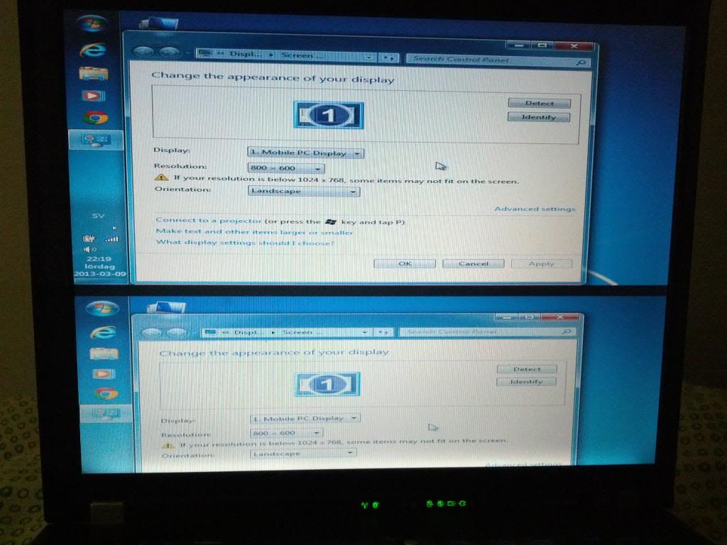 I have windows 7 professional running on my thinkpad t61 laptop. One day when I restarted my laptop, suddenly the display is divided in two horizontal identical screens. I checked with Win + p key and found that no second device is connected. When I connect my TV with VGA, and duplicate/extend the display, I see ok in TV, but my laptop preserves two screen.